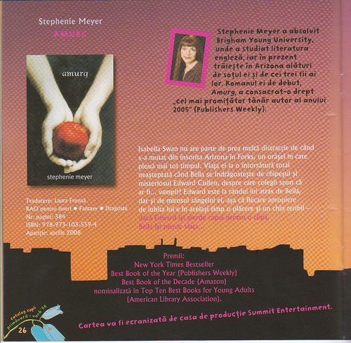 Eu am citit cartile in engleza dar mi le-am cumparat si in romana. Felicitari pt. traducere. Sincer, nu ma asteptam sa fie chiar atat de buna (de obicei traducerile pe care le-am citit m-au dezamagit, dar asta a fost f. buna). Pacat ca editura lasa de dorit :(. Am gasit o groaza de greseli…cred ca nici n-au dat cartea la corectat. Pacat…