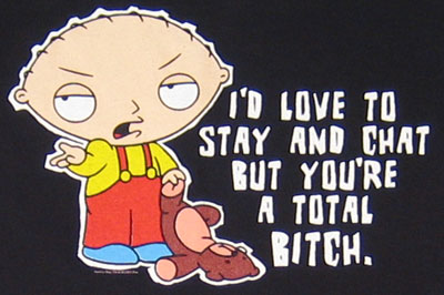 Zilele astea am făcut un Family Guy marathon uitându-mă (spre fericirea mea nu tot timpul singură) la cele mai tari faze. Pot să mă uit de o mie de ori la unele dintre ele şi tot sunt pe jos de râs. Se apropie ziua mea. Îmi doresc un tricou cu imaginea de mai jos.