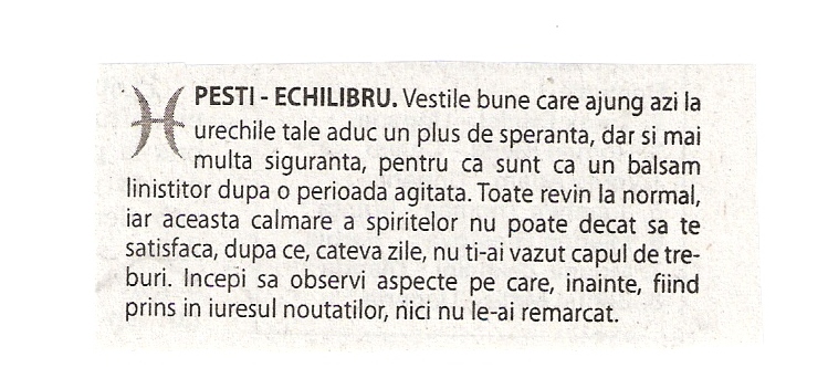 Ştiam eu că m-au auzit cei de la Ziua cum m-am plâns de horoscop. Poate chiar mi-au citit şi blogul. Poate s-au temut de mine, poate s-au temut că atunci când ne vom întâlni jos la automatul de cafea voi sacrifica una dintre cafele pe unul dintre ei. Nu contează de ce însă horoscopul meu de azi arată în felul următor: