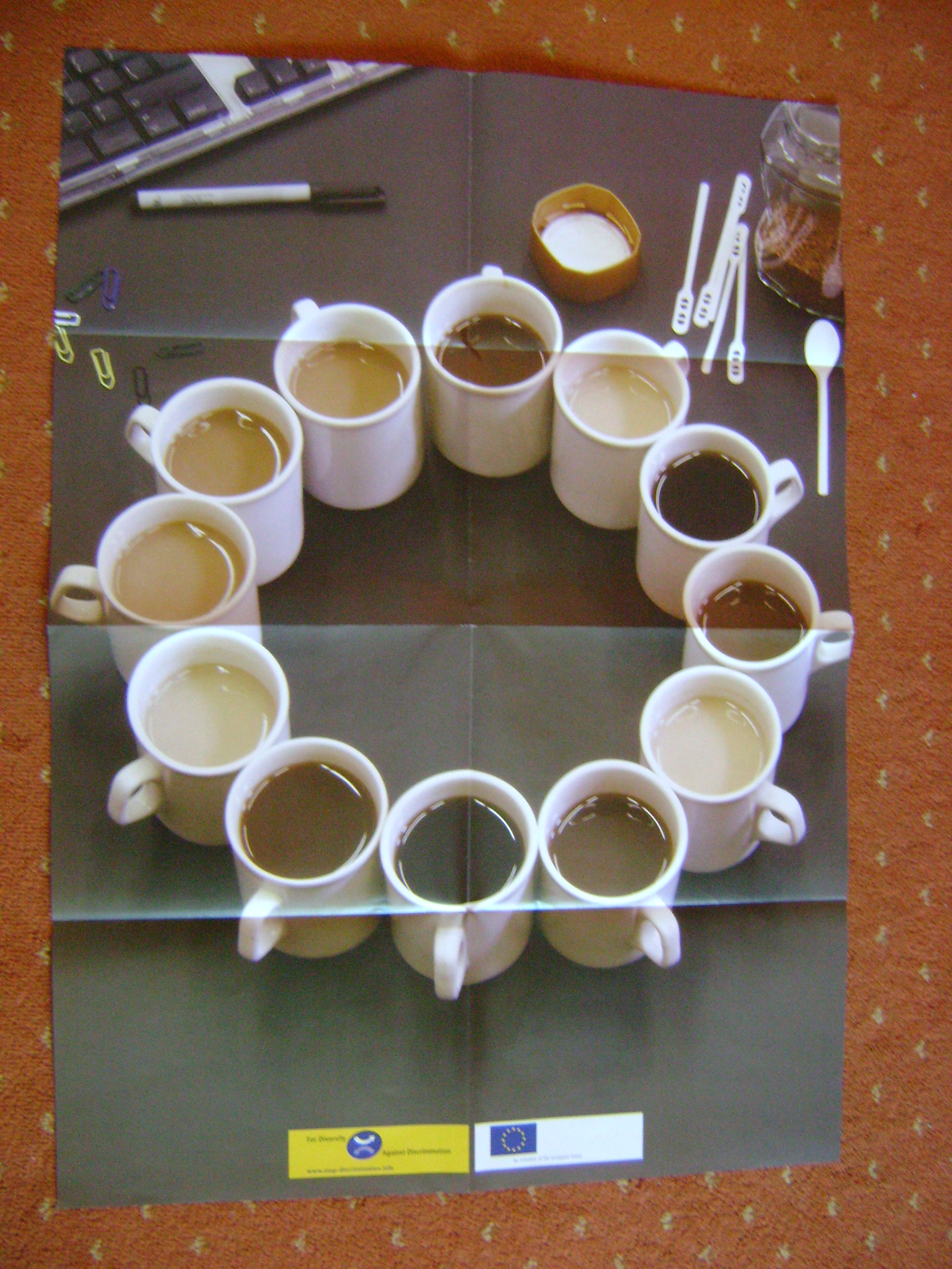 Mi se pare un afiş foarte bine gândit şi realizat şi mi-aş dori să pot felicita persoana sau persoanele care l-au făcut. Şi plus de asta îmi şi place cafeaua la nebunie de orice culoare ar fi ea (şi da, prin asta am vrut să spun şi că iubesc oamenii indiferent de ce culoare ar avea ei la piele, indiferent de sex sau orientare sexuală, indiferent de religie sau orice alte motive stupide de discriminare se mai găsesc în zilele noastre). Dacă mi-ar sta în putere cred că aş pune câte un afiş ca acesta în fiecare şcoală, în fiecare grădiniţă, în fiecare universitate, în fiecare cafenea, pe fiecare stâlp de pe stradă. Poate că n-ar elimina discriminarea cu totul dar cu siguranţă ar fi nişte paşi mici spre conştientizare şi schimbare în bine a mentalităţii unor oameni.