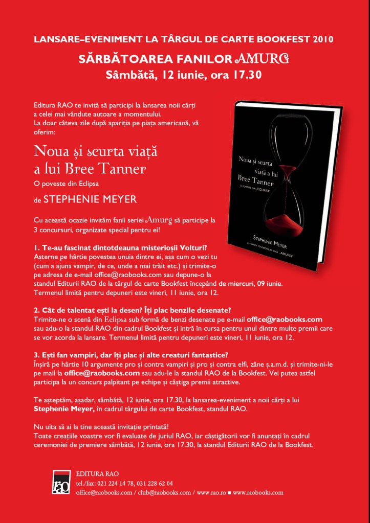 Editura Rao organizează un concurs foarte frumos pentru toată lumea pasionată de seria cărţilor Amurg. Găsiţi detalii pe blogul Laurei. Avem onoarea să facem şi parte din juriul acestui concurs deci ne vedem pe 12 iunie la 17:30 la standul editurii Rao să participăm împreună la lansarea cărţii Noua şi scurta viaţă a lui Bree Tanner.