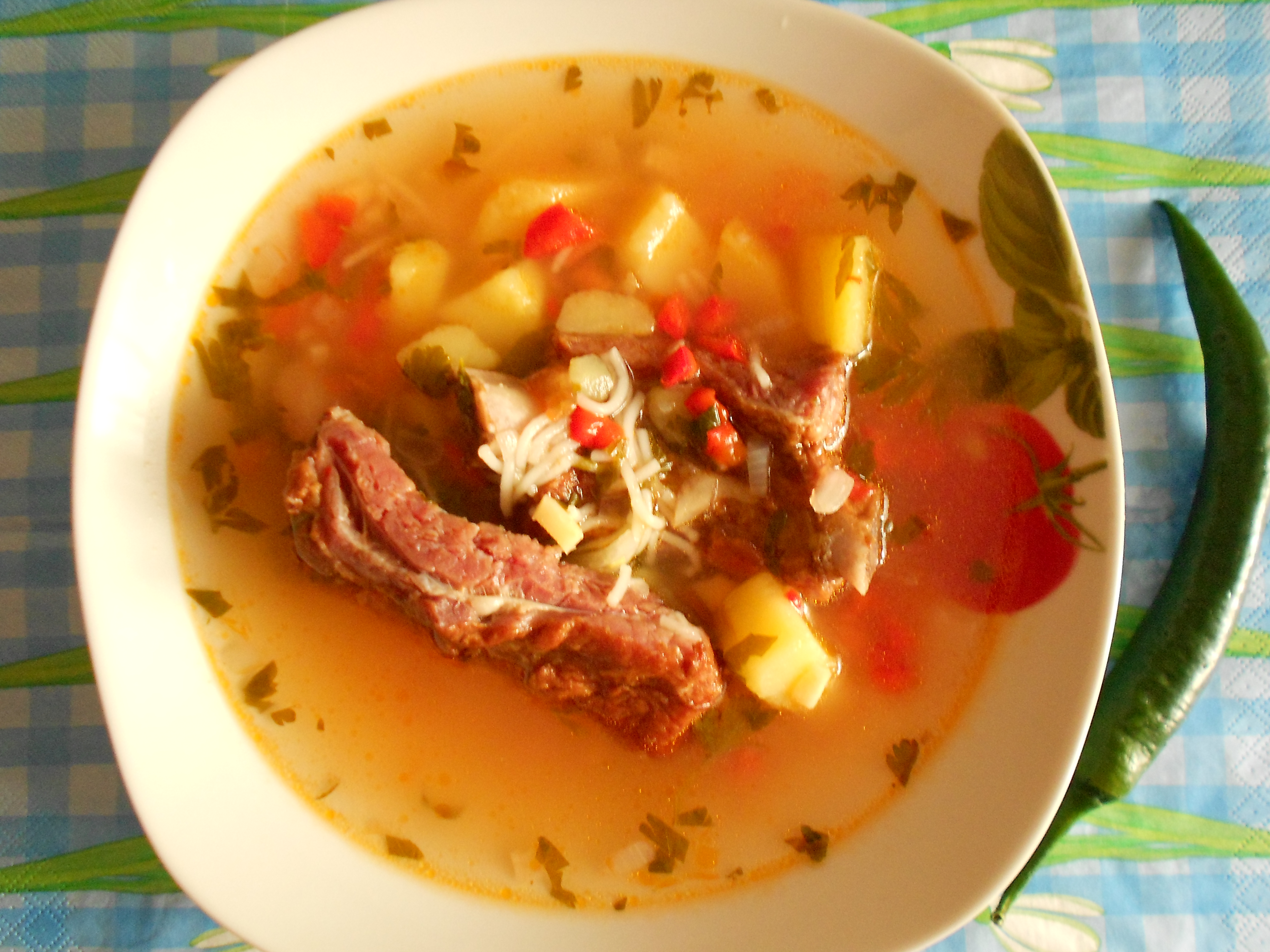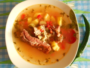 Pe lângă borşul de fasole cu urzici, borşul cu oase afumate este în top ten mâncăruri după care mă dădeam în vânt când eram acasă la mama. Era singurul borş cu carne pe care-l mâncam cu plăcere şi a doua şi a treia zi, nu trebuia să fie neapărat proaspăt luat de pe foc (aşa cum e cel de pui, de exemplu, pe care nu-mi vine să-l mai mănânc a doua zi). Aşa de bun era că parcă niciodată nu aveam suficiente oase, aşa cum în celălalt niciodată nu mă săturam de urzici. Azi am făcut o oală mare de borş în care am pus oase să ne ajungă. A ieşit foarte bun însă pentru că nu sunt o mare pasionată de gătit, nu pot să spun mi-a ieşit chiar ca la mama acasă. Aşa cum în copilărie aş fi mâncat numai cartofi prăjiţi şi salam cu pâine, aşa aş mânca acum mâncăruri gătite fel de fel. Aşa că mă mobilizez să gătesc când am timp şi energie, atât cât pot eu şi nu pot să spun că-mi pare rău, aproape de fiecare dată în iese bine (asta şi pentru că nu prea risc să fac reţete complicate/sofisticate). Şi borşul meu de astăzi:
