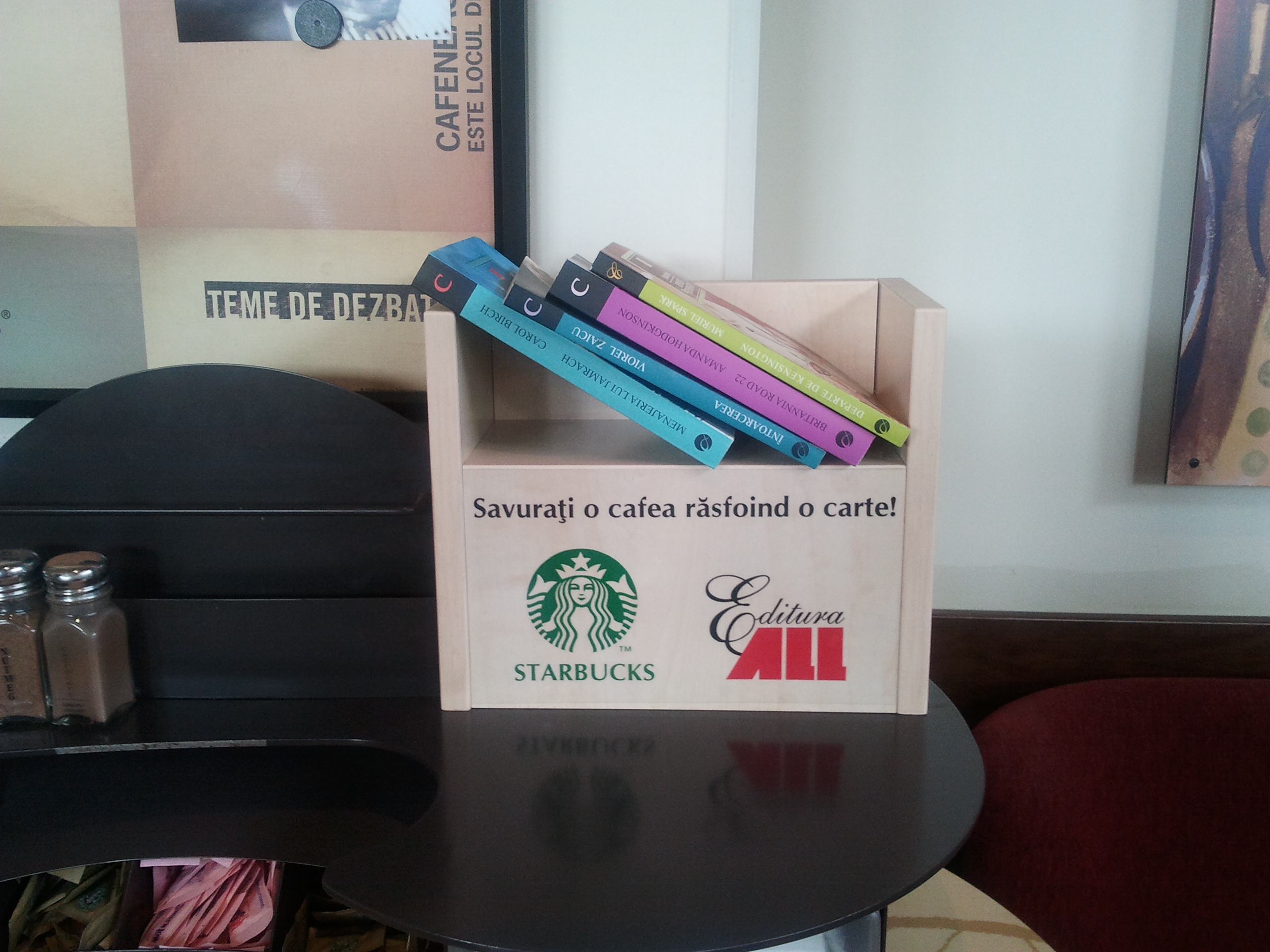 Ştiu că lumea în general vine la cafenea ca să stea de vorbă însă nu e rău nici să te relaxezi de unul singur pe un fotoliu cu o carte în mână şi o cafea aburindă pe masă. Nu ştiu dacă erau mai multe cărţi, dacă le rotesc, sau cum şi cât funcţionează campania însă mi se pare o idee foarte bună. Două dintre cărţile din imagine îmi sunt foarte dragi, le-am citit şi le recomand. De două dintre ele n-am auzit însă cu siguranţă că le-aş fi răsfoit dacă nu m-aş fi grăbit astăzi. Poate data viitoare. E drept că decât să bei două cafele la Starbucks mai bine îţi cumperi una dintre cărţi însă … suntem şi noi oameni, trebuie din când în când să ne mai şi răfăţăm simţurile cu o cafea bună. Spor la citit! [Imaginea este făcută în Starbucks Sun Plaza].