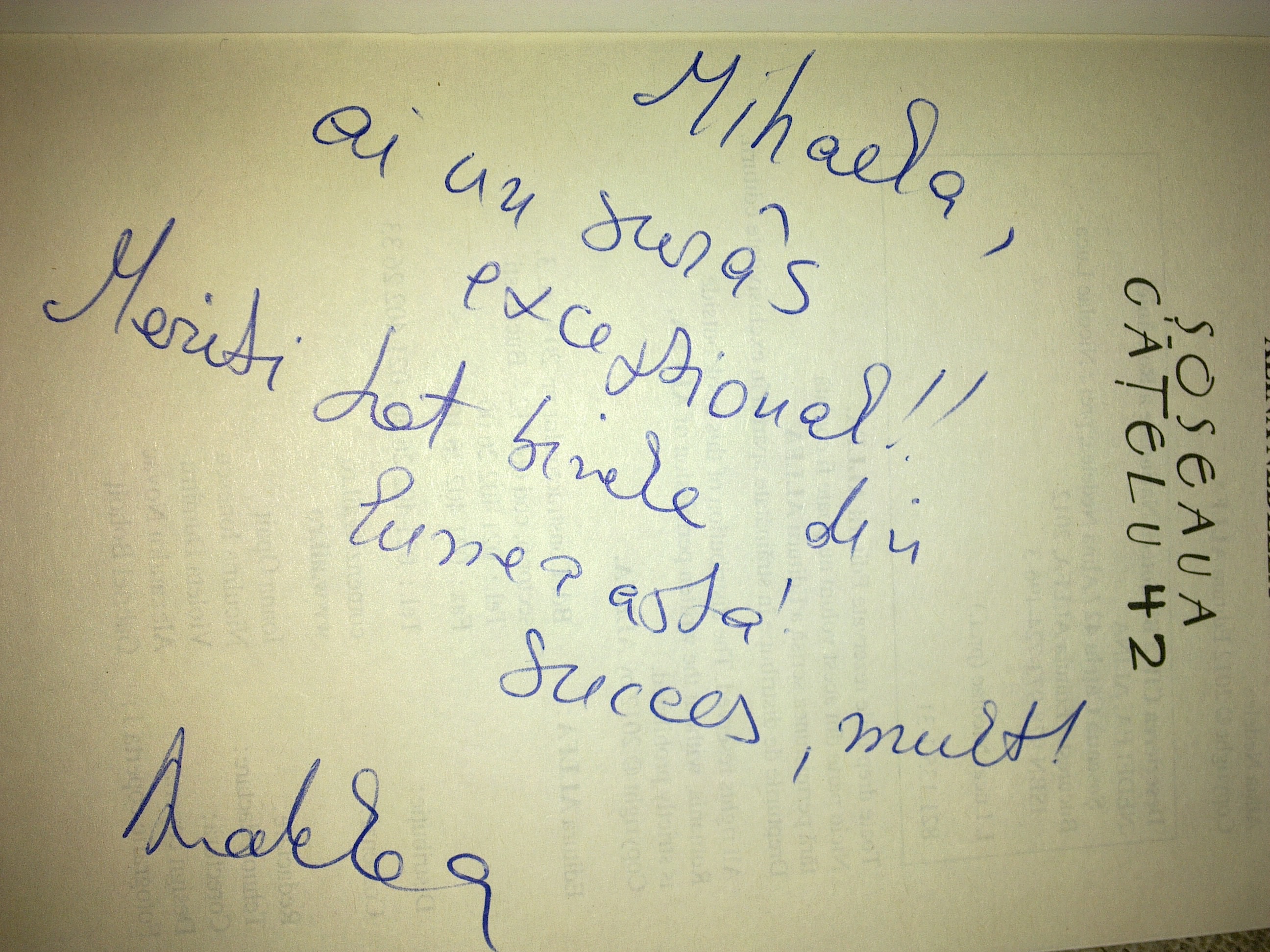 2. Ce frumos ti-a scris la autograf, imi place ca a dat autografe personalizate si imi place si ce a scris pe cartea mea pe care am devorat-o fara sa respir ieri pe tren. O sa incerc sa si scriu o postare despre ea.