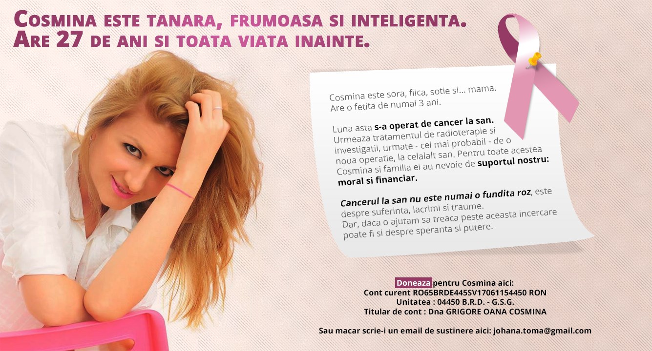 E colega mea, sunt şanse mari să fie şi colega voastră. E mamă, e soţie, e fiică, e prietenă, trece printr-un moment greu şi are nevoie de noi şi o puteţi ajuta donând în contul curent RO65BRDE445SV17061154450 RON, Unitatea : 04450 B.R.D. – G.S.G. Titular de cont : GRIGORE OANA COSMINA.