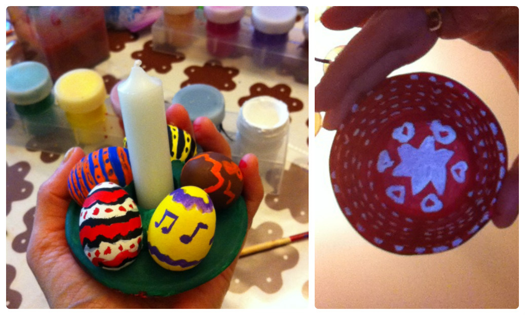 Şi în timp ce ea mă întreba şi mă ruga să răspund rar ca să aibă timp să scrie, eu pictam un coş cu ouă, decoraţiune de Paşte. Şi a fost timp de calitate. La propriu. Creşte draga noastră Eliza şi creşte frumos de tot.