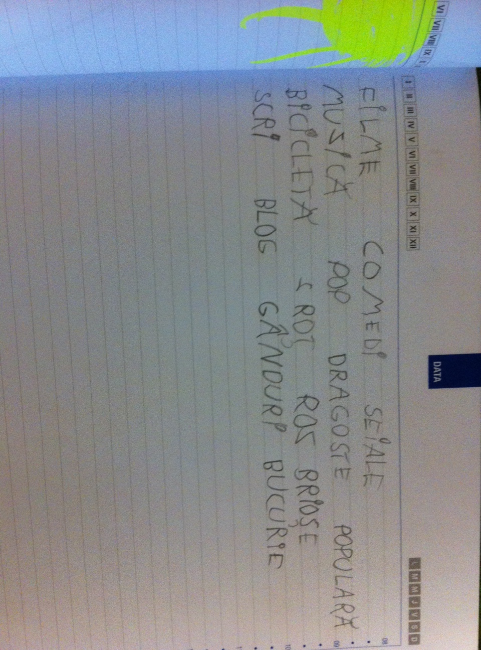 La şase ani şi un pic, cu ochelarii pe nas, agenda pe braţe şi creionul în mână, picior peste picior şi cu seriozitatea unui reporter, mi-a pus întrebări ca de la om mare la om mare. Eu am răspuns, ea şi-a luat notiţe. Că-mi plac filmele de comedie şi serialele. Că îmi place muzica pop si cea de dragoste şi uneori chiar şi populară. Că-mi place să merg pe bicicletă, cu două roţi (fără ajutătoare) şi dacă ar fi să-mi aleg o bicicletă cu model aş alege una roz  cu brioşe (nici acum nu ştiu de ce am zis asta dar sună tare simpatică o bicicletă desenată cu cupcakes colorate). Şi-a mai notat că-mi place să scriu pe blog gânduri despre bucurie. Asta după ce m-a întrebat dacă scriu gânduri despre tristeţe sau despre bucurie. Aş fi răspuns că despre amândouă şi uneori mai degrabă despre tristeţe dar de ce să înveţe ea de la mine să scrie prima oară cuvântul tristeţe când mai are atâţia ani de bucurie care o aşteaptă înainte?