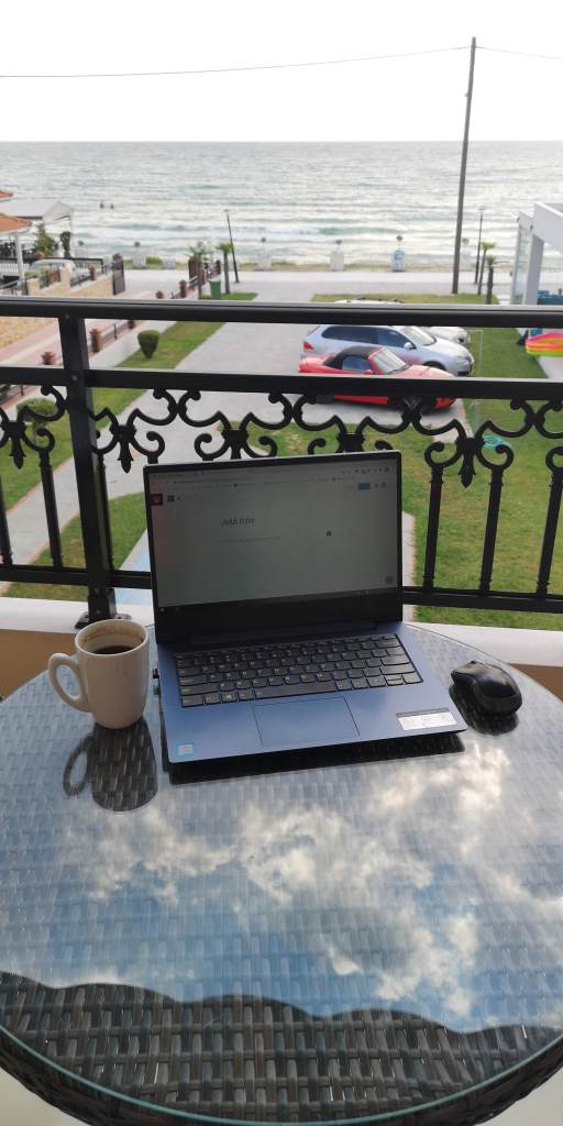 Dar începutul de fapt este cafeaua. Care pentru mine este un aliment în sine. De regulă, atunci când călătoresc, beau cafeaua în oraș, sau pe drum deja către vreun obiectiv turistic. Aici am făcut o excepție și, pentru că am avut în cameră și o mini-bucătărie (cu plită electrică și un fierbător), am preferat să iau cafea grecească de la supermaket și să îmi fac eu zilnic. De ce excepția? Pentru că priveliștea. Având balconul cu vedere la mare, preferam să beau cafeaua, imediat după trezire, fix acolo pe balcon. Nu aș putea spune că e favorita mea însă ce-mi place cel mai mult la cafeaua grecească este că merge de minune fără pic de zahăr, parcă nu are deloc gust amar așa simplă. Plus o consistență diferită, ca de mâl, dacă înțelegeți ce vreau să spun, ceea ce e și bine și rău. Bine este că o poți bea îmediat, nu se ridică zaț la suprafață, rău este că spre final chiar poate să aibă gust de mâl. Nu pare apetisant, nu? E ok totuși, băubilă, mai ales cu așa priveliște.