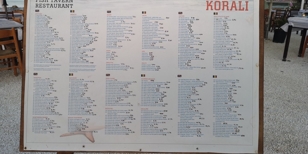 Ca să vă faceți o idee de prețuri, am pozat meniul de la una dintre terase. Erau cam la fel peste tot, cu prea mici diferențe. Cred că ar trebui să descărcați poza și să dați zoom, nu știu dacă se vede foarte bine așa. Dacă aveți o curiozitate anume, mă puteți întreba în comentarii și vă spun din poza originală.