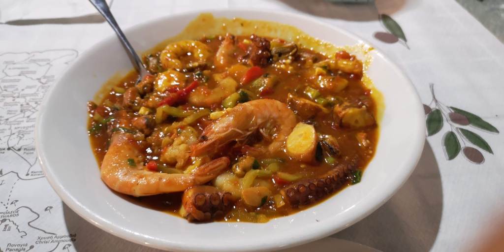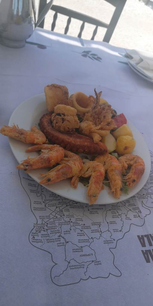 Vă arăt mai jos, nu neapărat în ordinea asta: Saganaki cu fructe de mare – o mâncare pe care am luat-o de două ori de la terasa unde am mâncat cel mai des și pe care o recomand cu mare căldură în Thassos, Skala Potamia – Captain Fish Taverna, Mix de fructe de mare la grătar – nu pot să spun că mă dau în vânt după fructe de mare la grătar deci nu mi-aș mai lua încă o dată, mix de fructe de mare prăjite (delicioase), scoici, creveți prăjiți pe pat de orez și un sos minunat de lămâie. Acest ultimul fel a fost luat de la o altă terasă, unde ne-a plăcut de asemenea foarte mult și unde priveliștea îți taie respirația (Agorastos Taverna).