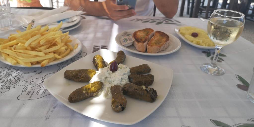 Îmi plac foarte mult sărmăluțele în foi de viță. Se vede că veneau mulți români acolo la terasă că, atunci când am comandat, primul lucru pe care mi l-a spus persoana care ne-a preluat comanda a fost că nu au carne, ceea ce știam deja, eu le prefer oricum așa, doar cu orez, ușor acrișoare și cu sosul de tzatziki.
