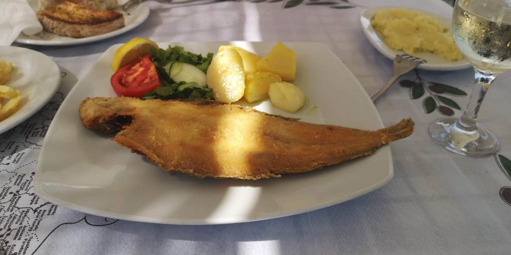 Această jumătare de pește, puțin cam scumpă după cum s-a exprimat și persoana care ne-a servit (adică era 50 euro kilogramul, o porție având cam între 300 – 400 gr), este limbă de mare și este unul dintre cei mai gustoși pești pe care i-am mâncat. Undeva în fundal se vede niște pastă de usturoi care este de fapt un soi de piure de cartofi cu gust de usturoi, se pare că tot o mâncare specifică lor (și delicioasă).