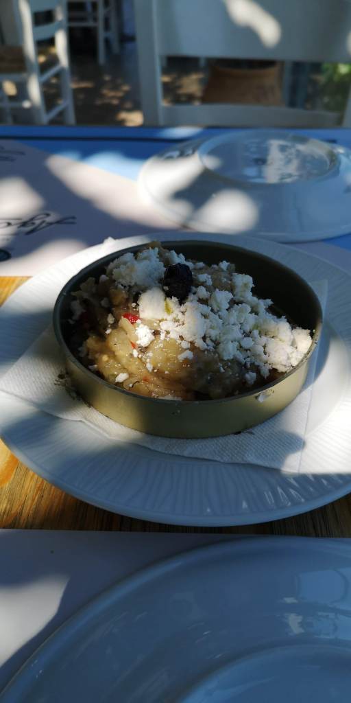 Calamarul umplut mult lăudat nu a fost pe gustul meu însă mă bucur că l-am încercat. Cumva se pare că această combinație de calamar cu umplutură de brânză nu e tocmai cea mai preferată de mine. Niște vinete care nu sunt ca la noi, însă combinația cu brânză este foarte gustoasă. Pasta de usturoi despre care vă povesteam mai sus și încă un saganaki (că doar am luat de două ori). Și un gyros la farfurie care nu a avut cine știe ce gust. Bine, după atâta pește și fructe de mare și legume parcă nu prea mai aveam poftă de carne.