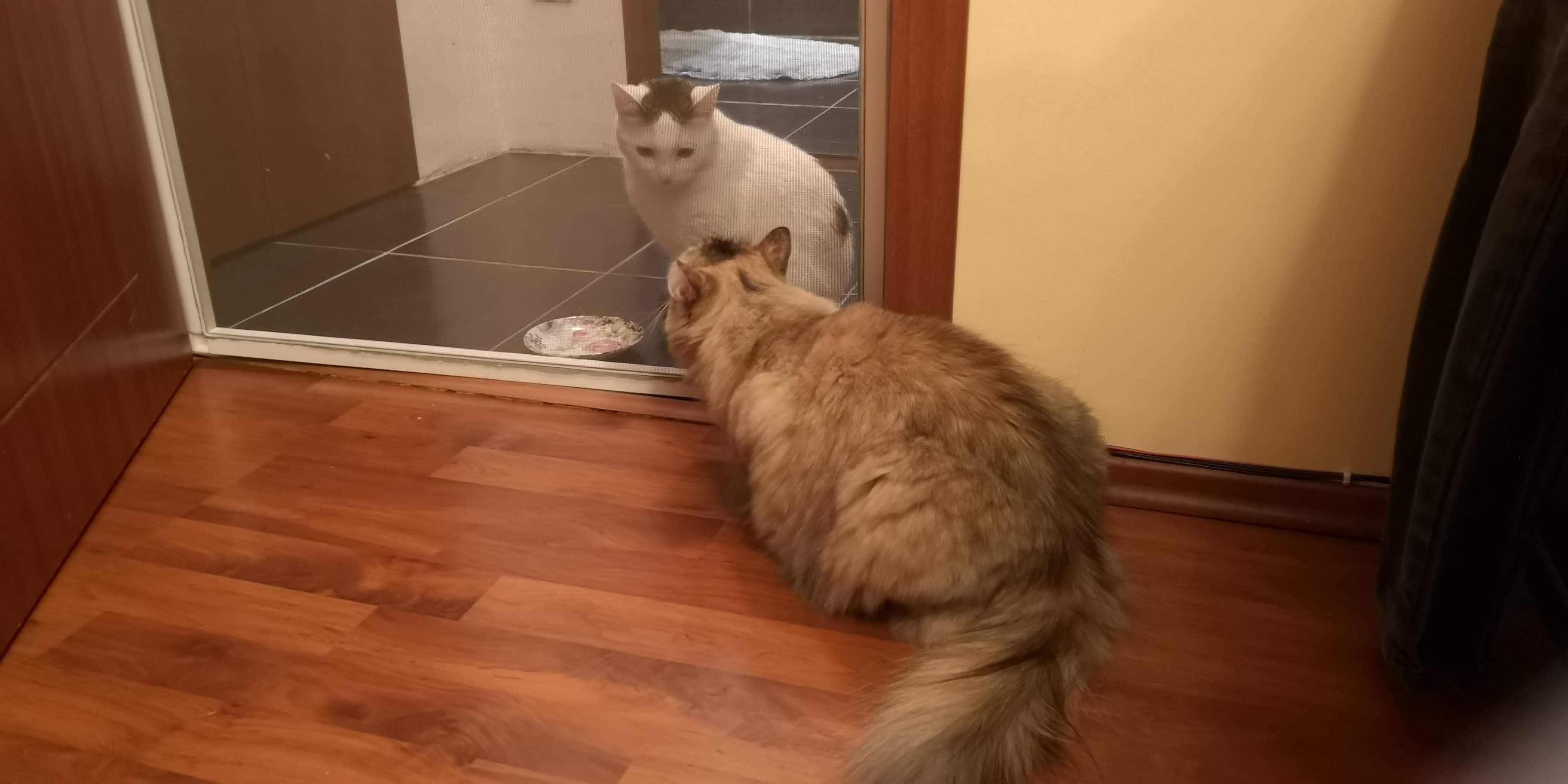 Pentru că noi le-am ținut separate vreo două săptămâni, au apucat să-și simtă mirosul prin aer/pe sub uși, pe hainele noastre, cred că întâlnirea față în față nu a fost o mare surpriză. Deși au avut o plasă între ele la primele întâlniri, nu au fost semnale grave că nu s-ar accepta. Dacă e să mă uit în urmă cred că în total, în vreo trei săptămâni, s-au hâsâit o dată, de două ori maxim. În rest, se aleargă prin casă și se hârjonesc, în cele mai multe cazuri, în joacă.