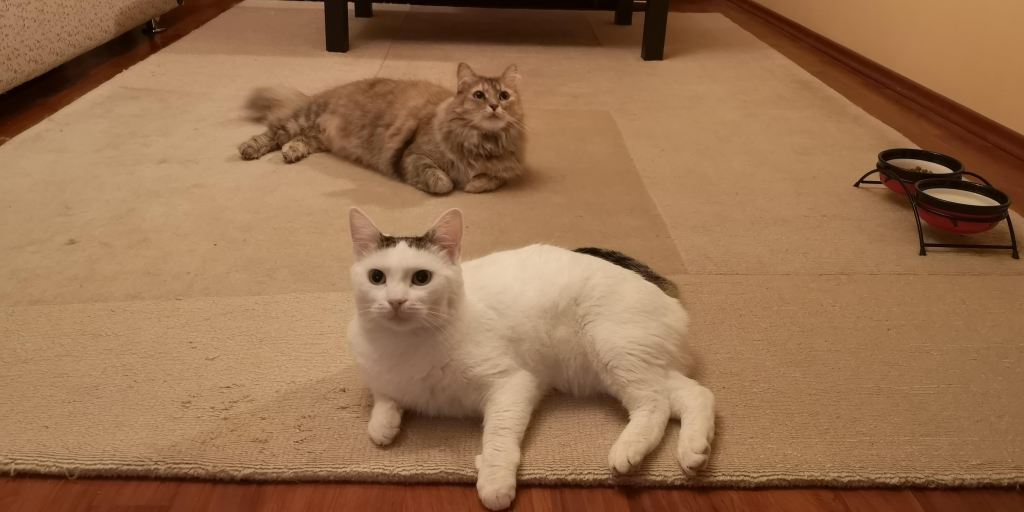 Și ca să scurtăm puțin povestea, am adoptat pisica (deși inițial o pusesem pe Facebook că poate îi găsim un stăpân, mă cam speria ideea de două pisici) și face parte din familia noastră acum. O cheamă Alba (super creativ, știm), alintată Albuța, Albuțel și toate cele și suntem foarte bucuroși, atât pentru că Alba e clar o pisică făcută să stea în casă și apoi pentru că se vede cu ochiul liber că lui îi Jinx îi este mai bine cu o prietenă/surioară.