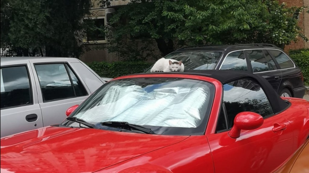 Îi era comod acolo că mașina, spre deosebire de altele din parcare, are soft top și stătea tolănită acolo la soare de o dădeai greu jos de pe ea atunci când plecai undeva cu mașina. De fapt, dacă mă gândesc bine, poate că era acolo și mai devreme de starea de urgență, nu mai știu. Ce știu este că atunci i-am acordat mai multă atenție, trăgând de timp să mai stăm puțin pe afară, după multe ore de lucru în casă, la calculator.